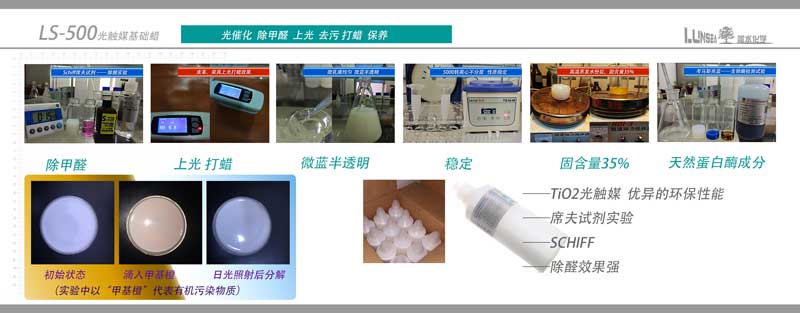 LS-500型光觸媒基礎(chǔ)蠟(Photocatalyst based wax),是藍(lán)水化學(xué)采用領(lǐng)先的米團(tuán)簇自組裝技術(shù)生產(chǎn)的一種具有光催化性能的去污上光基礎(chǔ)蠟。是一種含有納米二氧化鈦(TiO_2)光催化劑的除醛環(huán)保型去污上光蠟微乳液。